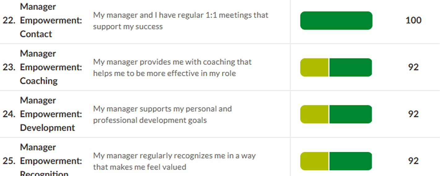 90% manager score, measured quarterly on axis including empowerment, coaching, growth, recognition