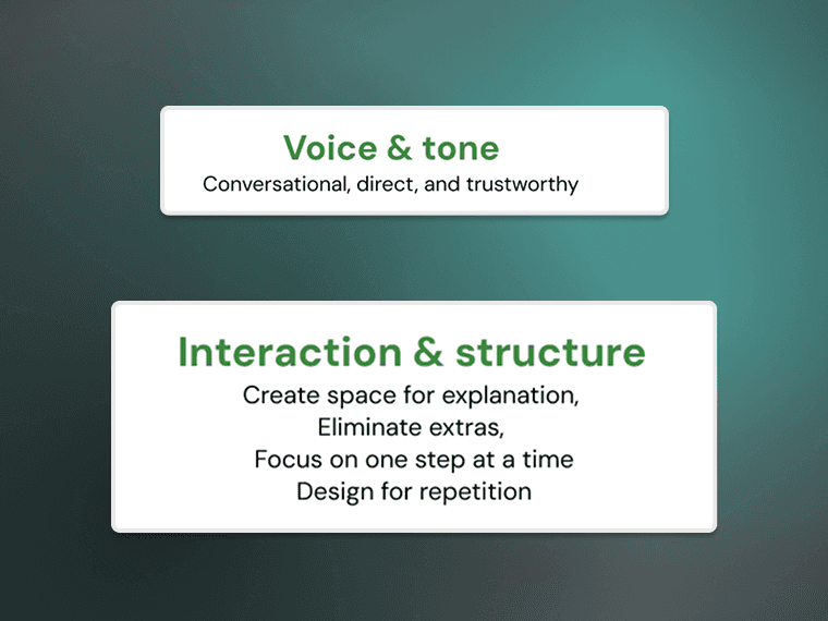 Led the creation of design design principles. I split them up between “Content” and “Interaction” so they could be more specific & impactful.