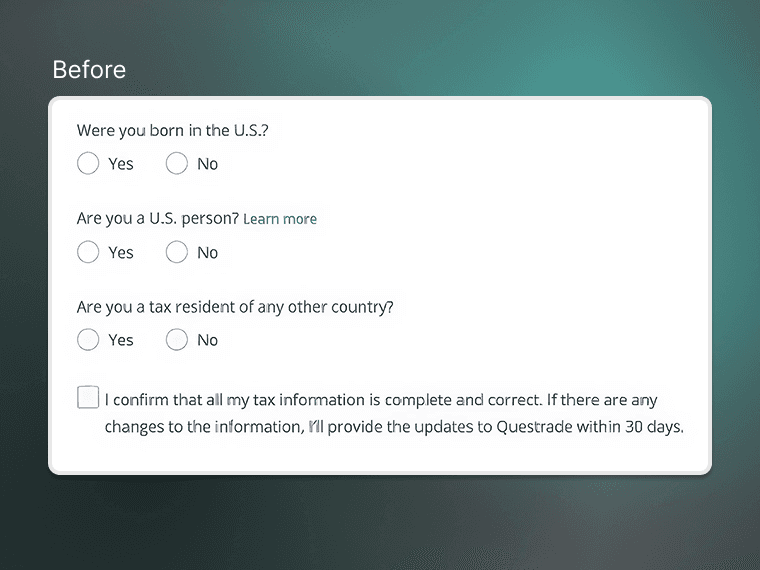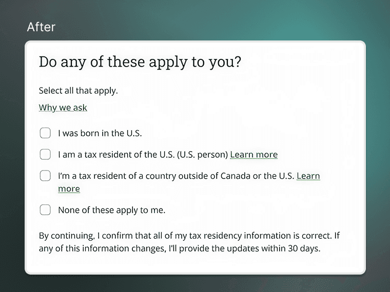 Approach: I knew this wasn’t just an interaction design problem, but a content one. I supported the content designer when working with Legal / Compliance teams to balance regulation needs, but deliver a simplified experience. Below is a before and after of one of many key areas users were dropping off previously.