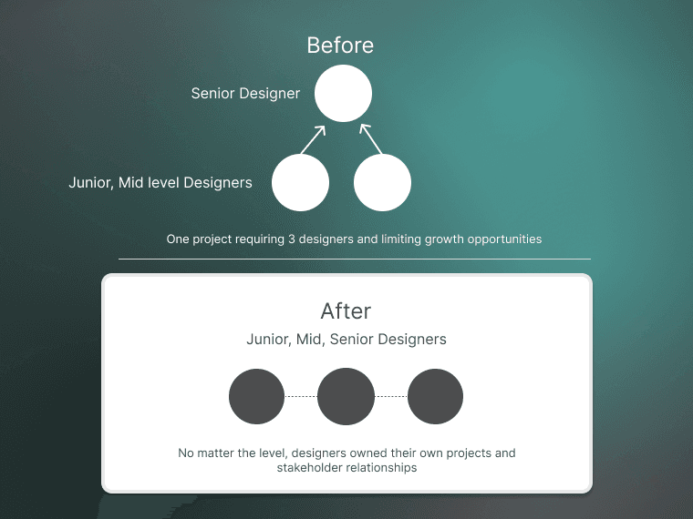 Before: Before I joined, junior designers were support designers for other senior members. With only 2 senior designers I knew this wouldn’t scale for all four of my initiatives.